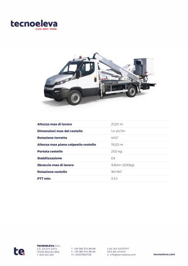 Raggiunge un’altezza massima di lavoro di 21 m, con sbraccio laterale ampio e portata del cesto idonea per operatori con attrezzatura.