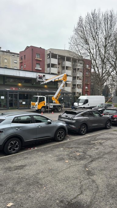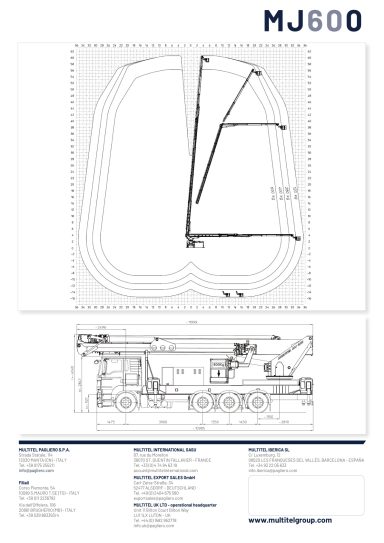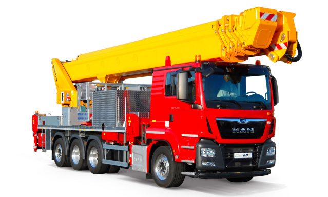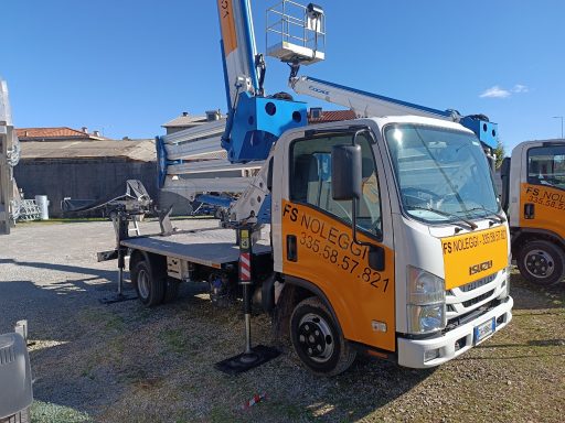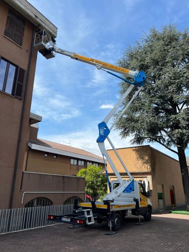 Piattaforma aerea telescopica allestita su autocarro.La rotazione della torretta di 360° continui, la cesta autolivellante da 2,50/3,80 x 0,90 m con rotazione 90° + 90°, il braccio principale con tre sfili telescopici e il jib in acciaio con elemento terminale in lega di alluminio dotato di due sfili telescopici, permettono all’operatore di aggirare eventuali ostacoli e di posizionarsi con precisione sull’area di lavoro.