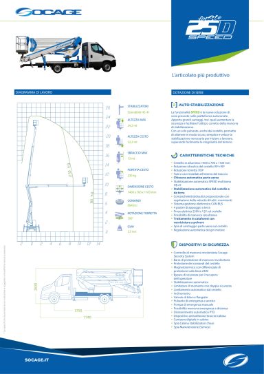La SOCAGE 28D Speed è una piattaforma aerea autocarrata articolata su autocarro da 3,5 t, dotata di sistema Speed per la stabilizzazione automatica rapida e sicura.