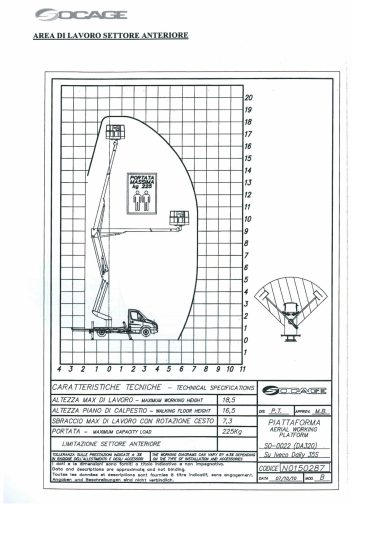 La SOCAGE DA320 è una piattaforma aerea autocarrata articolata, montata su autocarro da 3,5 t, progettata per lavori in quota che richiedono affidabilità, precisione e rapidità di posizionamento. Raggiunge un’altezza massima di lavoro di 20 metri con uno sbraccio laterale fino a 9,2 metri, consentendo interventi efficaci anche in presenza di ostacoli. Il cesto ha una portata massima di 225 kg, idonea per due operatori con attrezzatura. La rotazione continua della torretta a 360° e la rotazione del cesto garantiscono un’elevata manovrabilità e una copertura di lavoro ottimale.