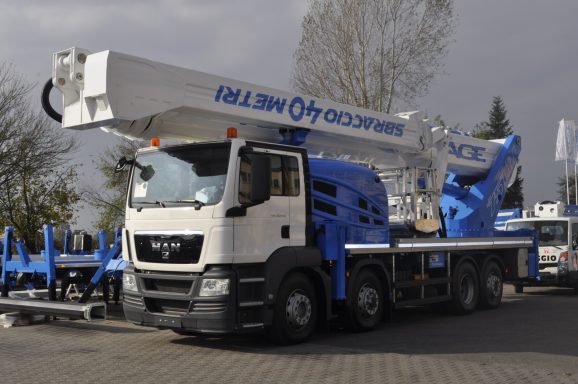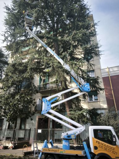 Raggiunge un’altezza massima di lavoro di 24 m, con sbraccio laterale fino a 12 m e portata del cestello di 200 kg.