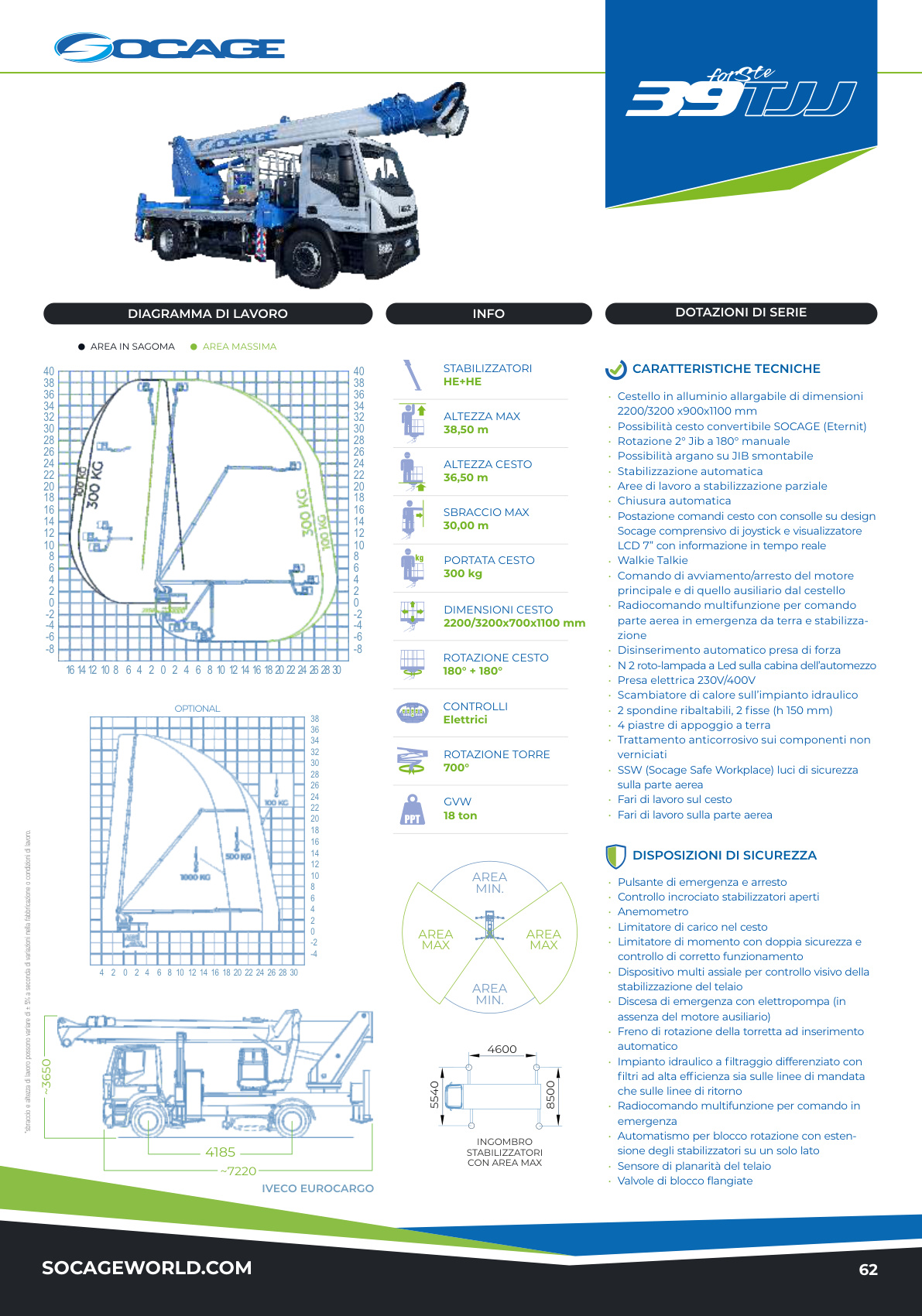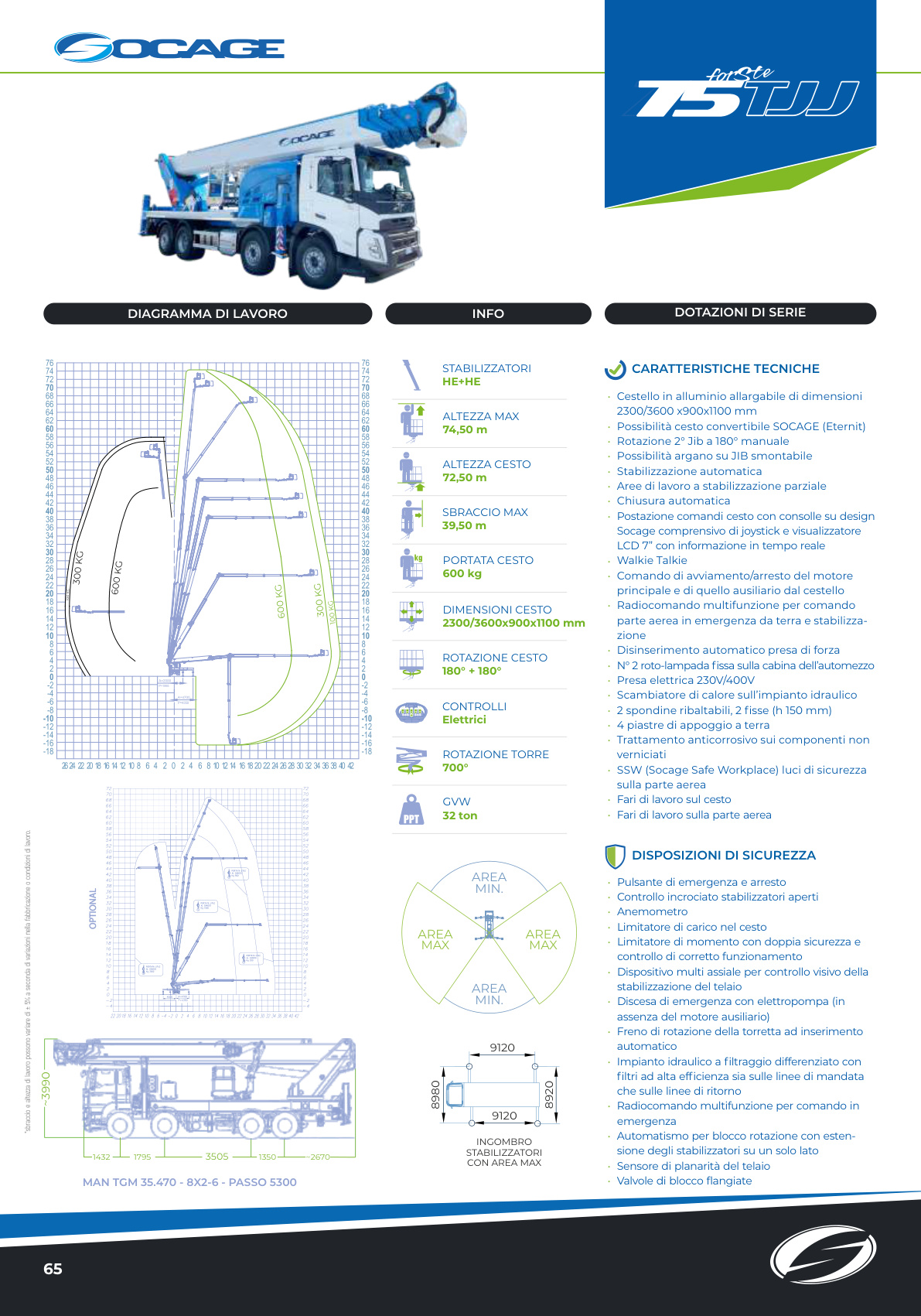 Le piattaforme autocarrate Socage da 39 e 75 metri sono progettate per lavori in quota che richiedono grande altezza operativa, sicurezza e precisione. Grazie al braccio telescopico con doppio JIB articolato, consentono di raggiungere facilmente anche punti difficili e superare ostacoli in facciata o copertura. Il modello da 39 metri è ideale per manutenzioni, lavori edili e interventi urbani, mentre la piattaforma da 75 metri è adatta a cantieri complessi, grandi edifici e impianti industriali. Entrambe garantiscono ampia area di lavoro, elevata stabilità e portata del cestello, permettendo operazioni efficienti e sicure in ogni contesto.