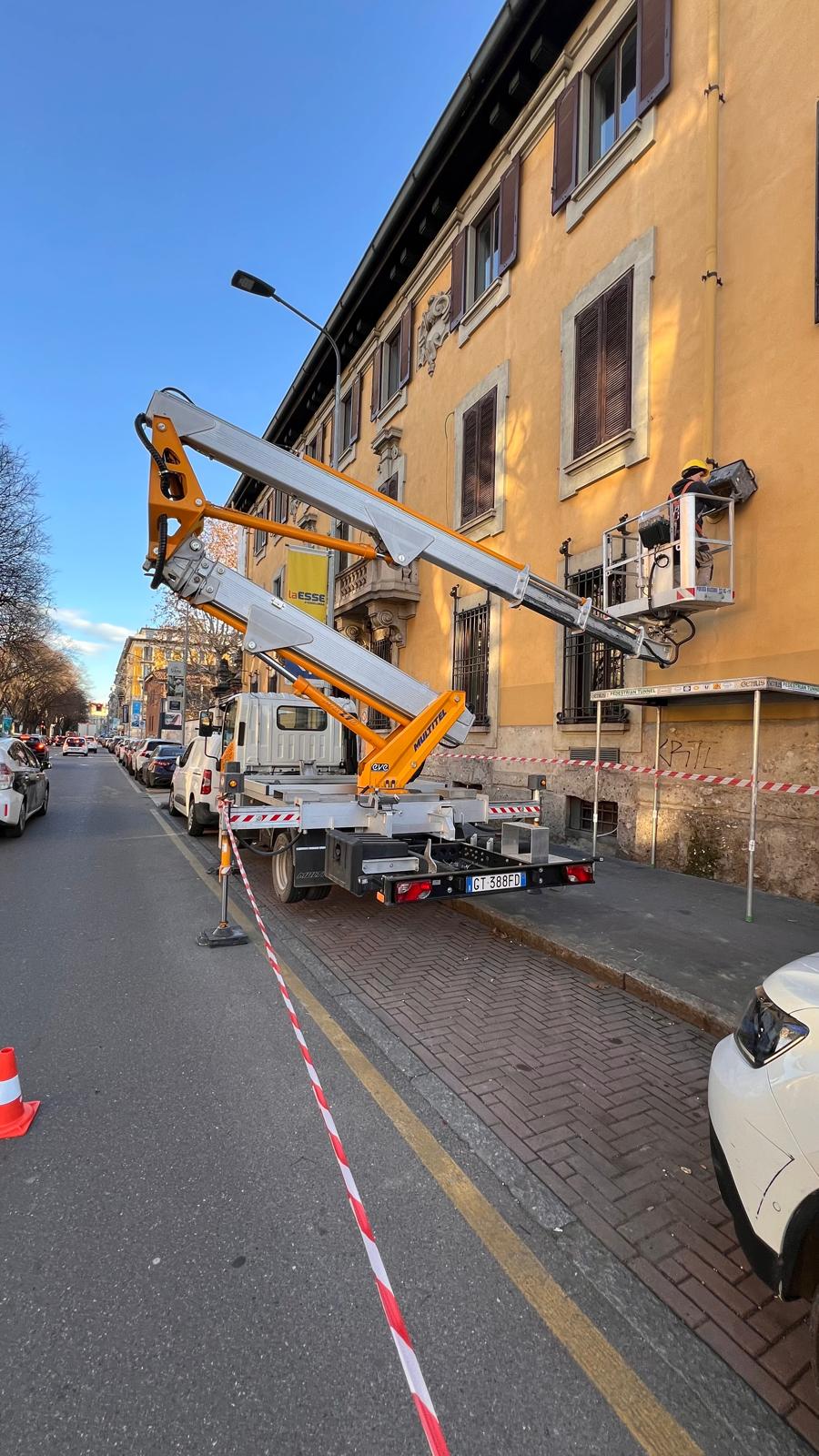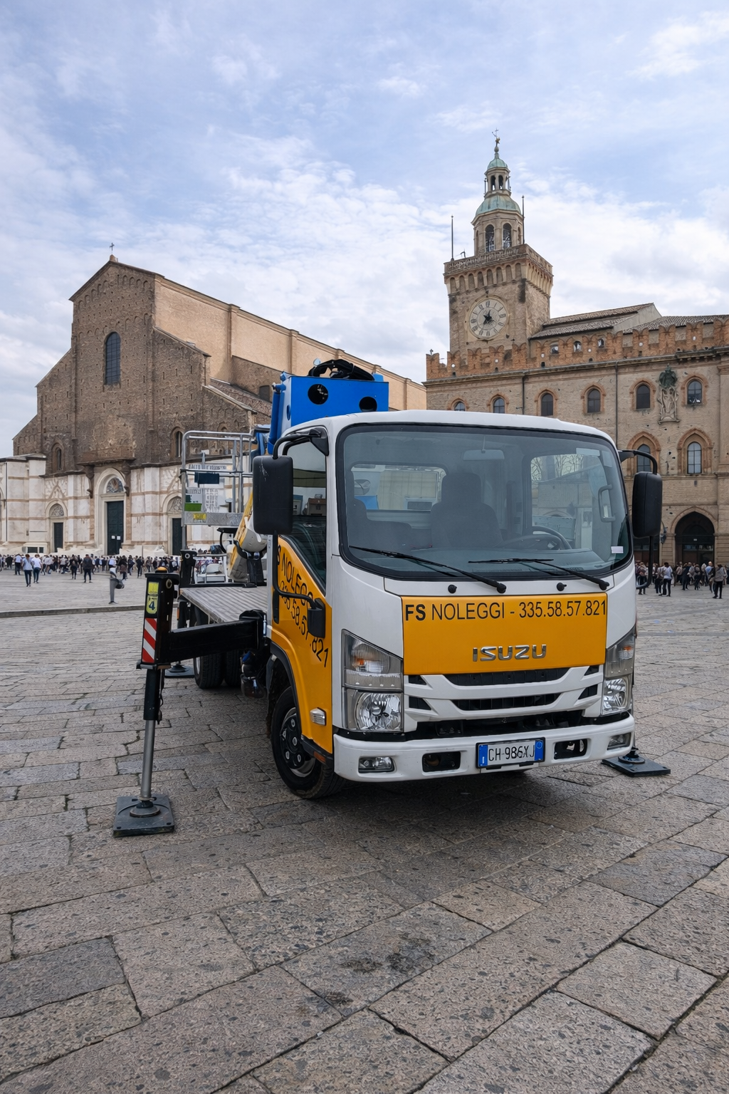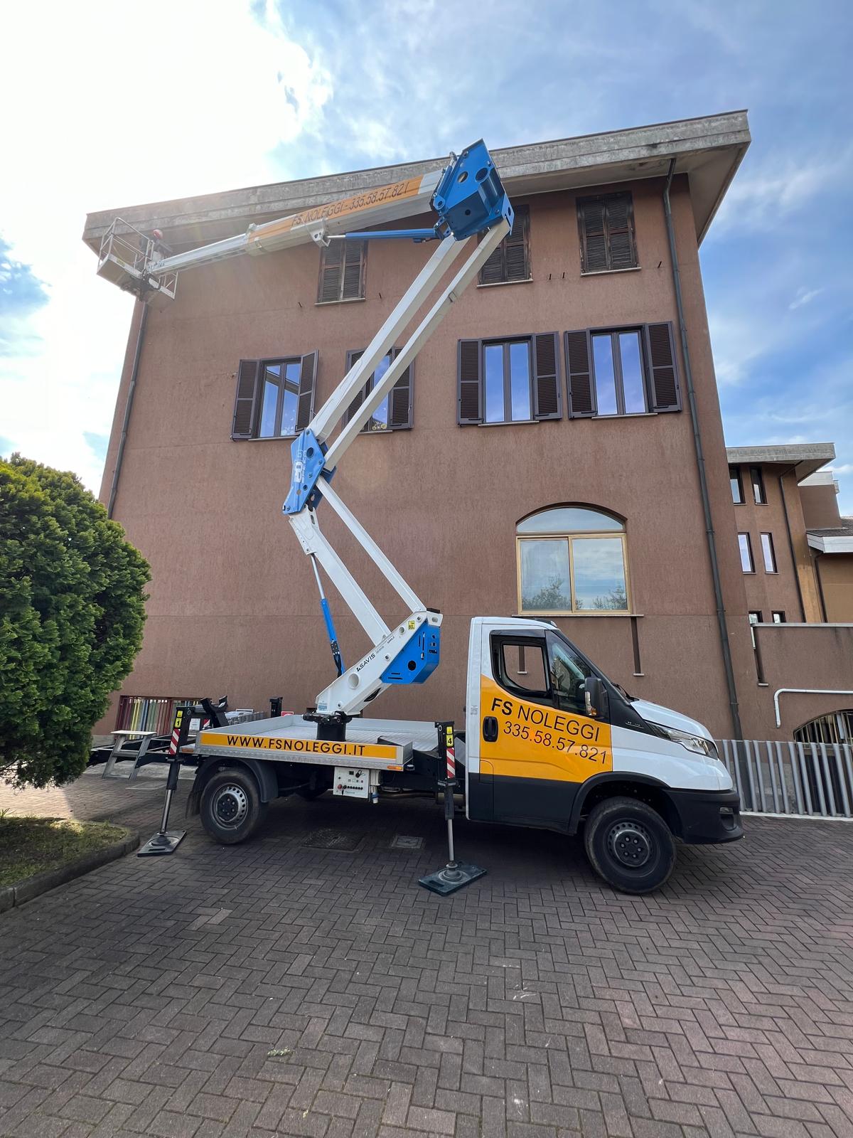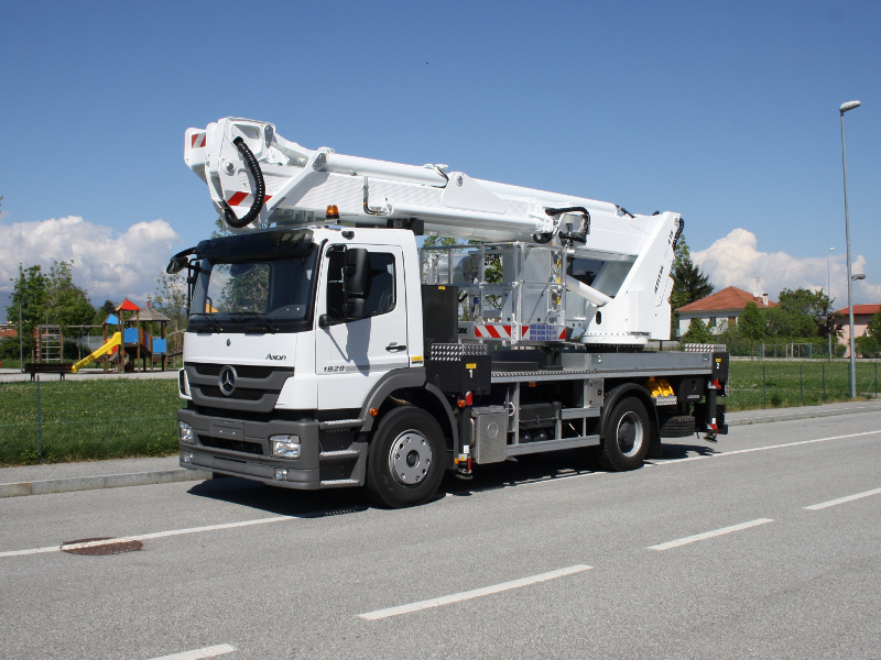 Piattaforma aerea telescopica allestita su autocarro.La rotazione della torretta di 360° continui, la cesta autolivellante da 2,50/3,80 x 0,90 m con rotazione 90° + 90°, il braccio principale con tre sfili telescopici e il jib in acciaio con elemento terminale in lega di alluminio dotato di due sfili telescopici, permettono all’operatore di aggirare eventuali ostacoli e di posizionarsi con precisione sull’area di lavoro.