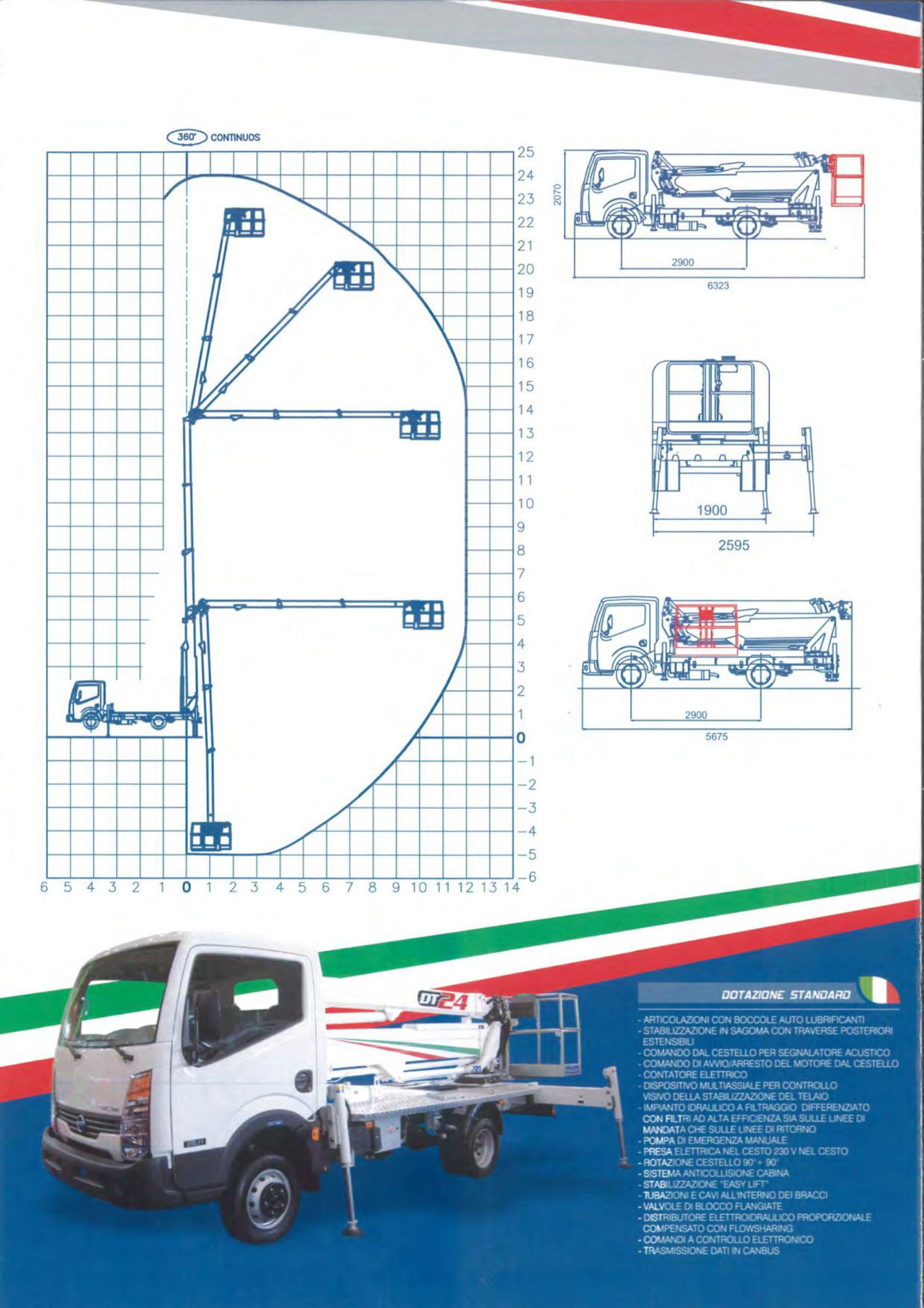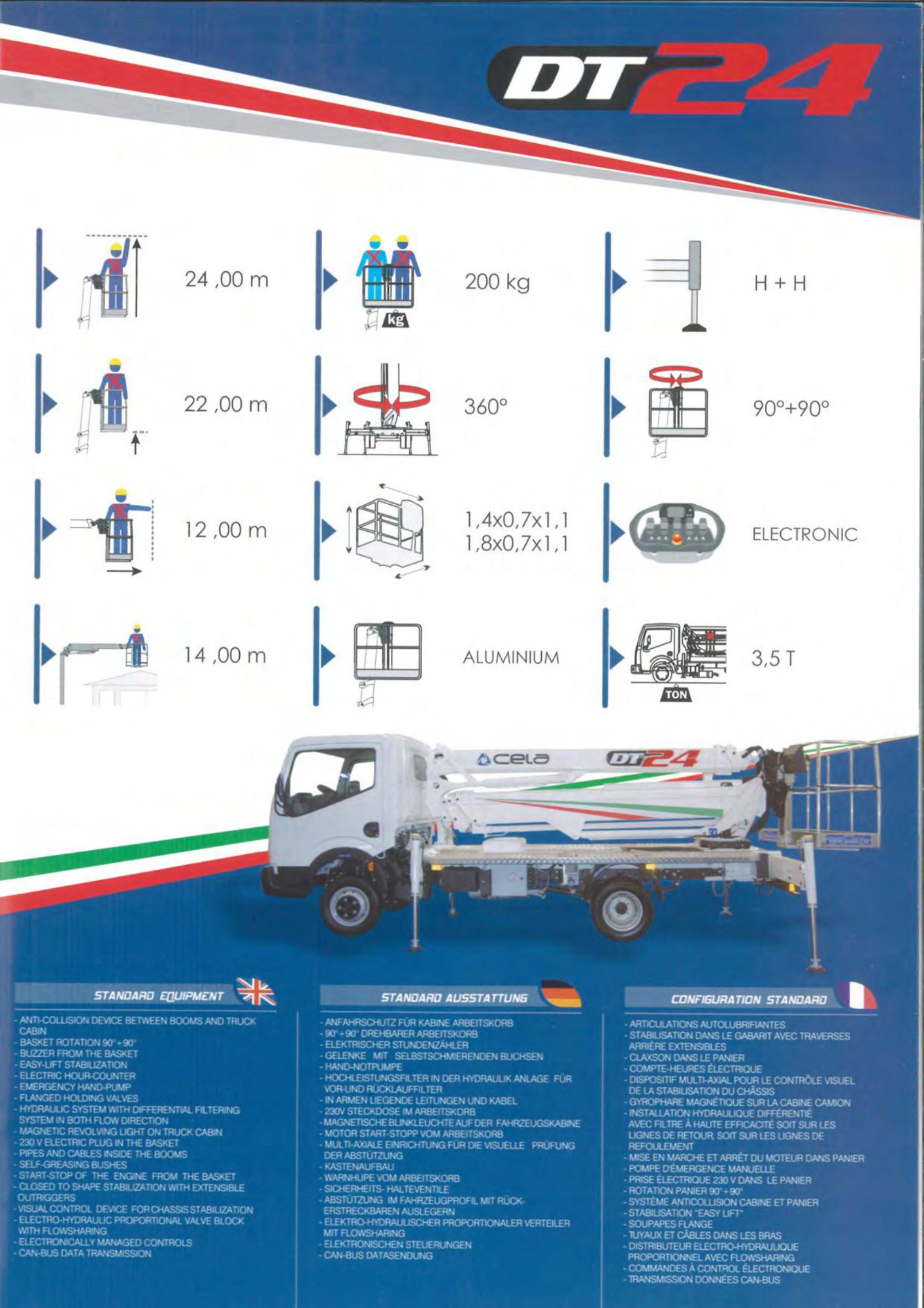 La CELA DT24 è una piattaforma aerea autocarrata con doppio braccio telescopico, montata su veicolo da 3,5 t.