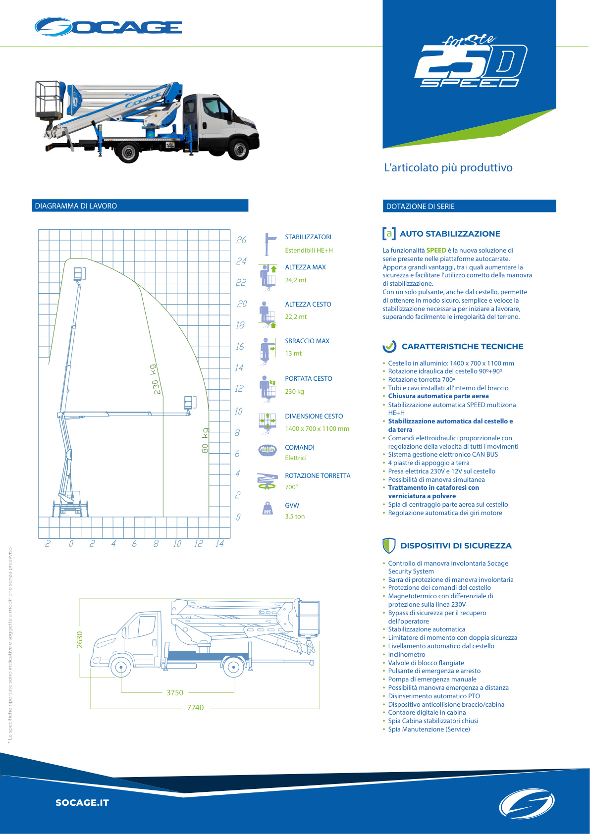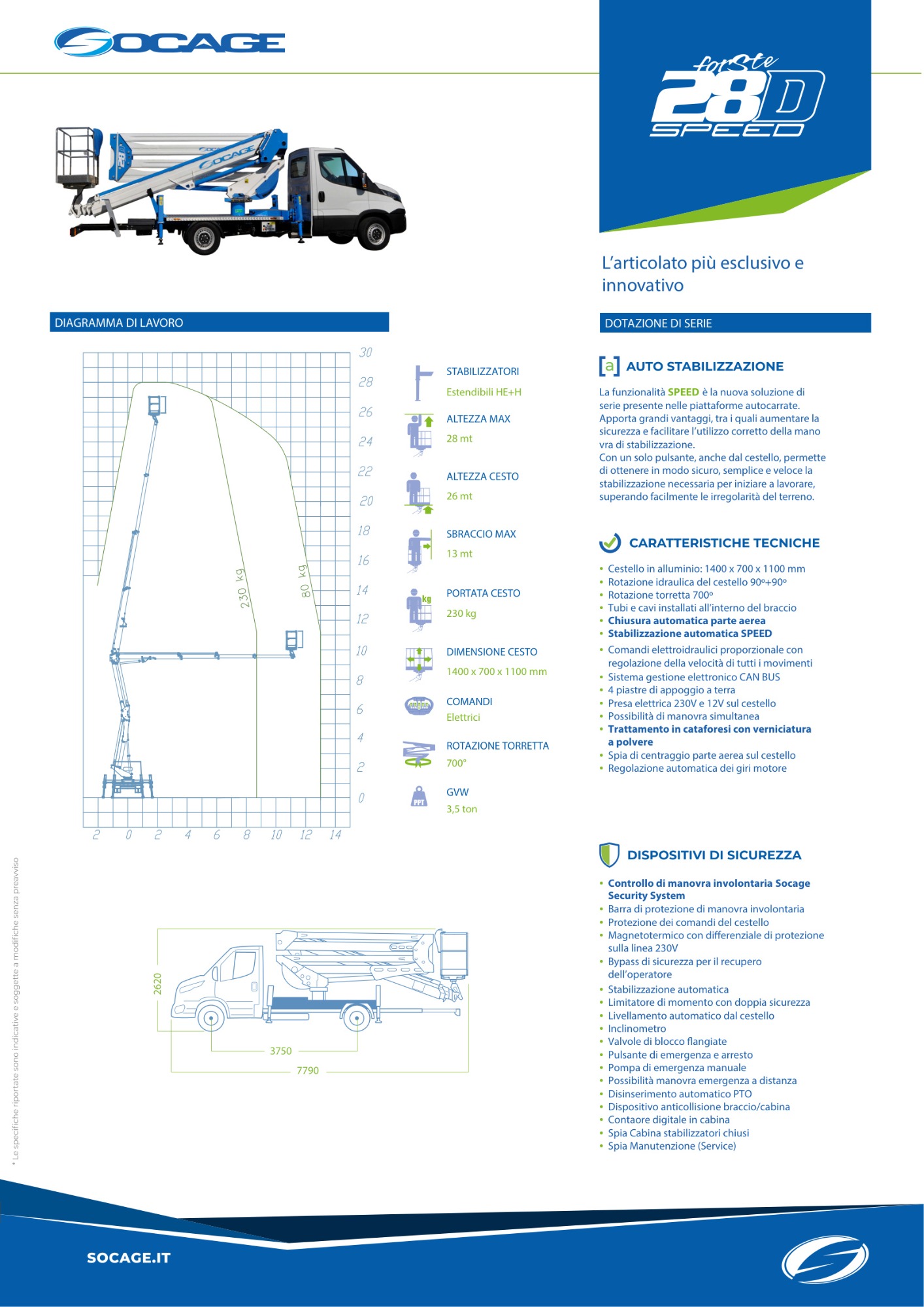La SOCAGE 28D Speed è una piattaforma aerea autocarrata articolata su autocarro da 3,5 t, dotata di sistema Speed per la stabilizzazione automatica rapida e sicura.