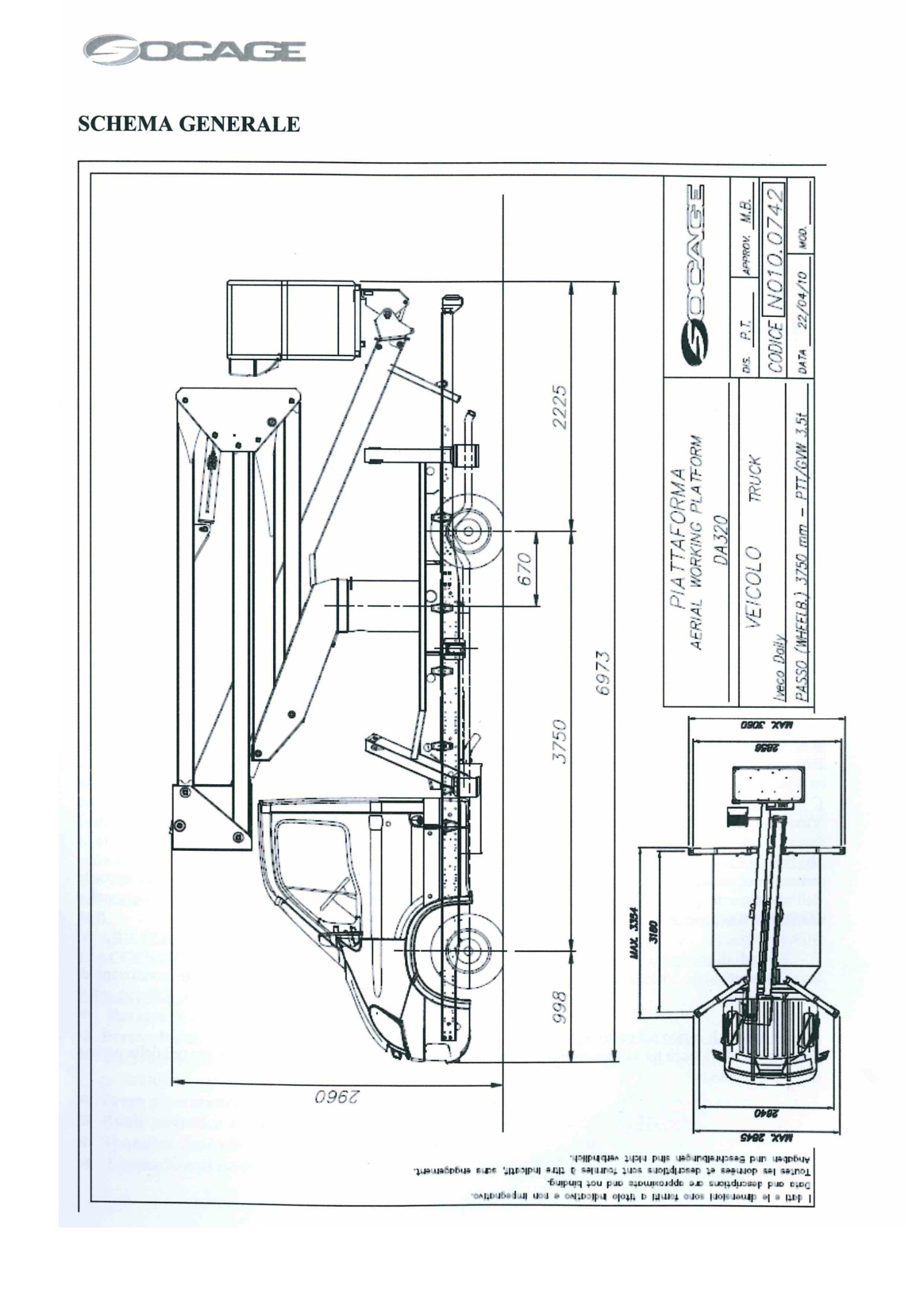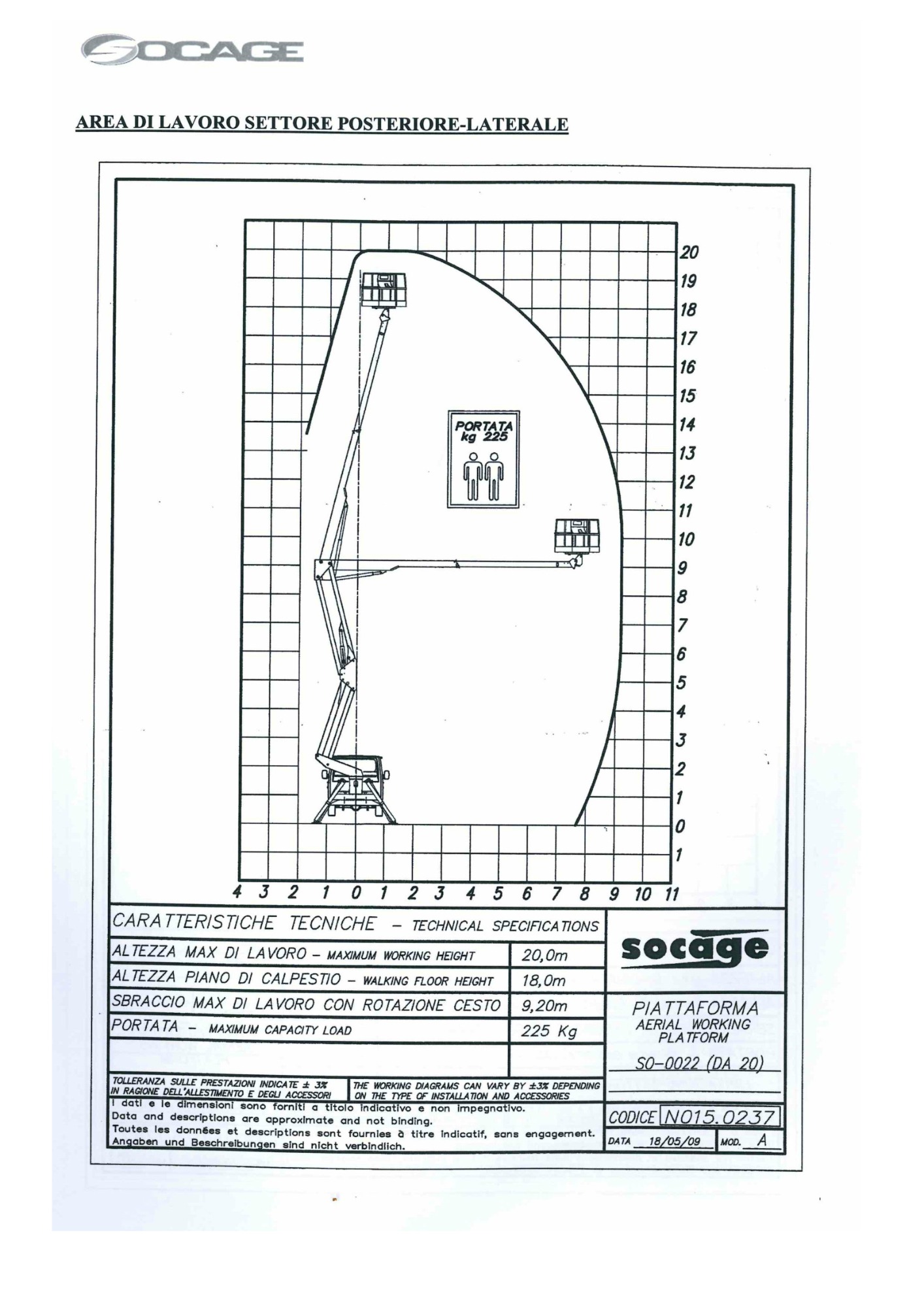 La SOCAGE DA320 è una piattaforma aerea autocarrata articolata, montata su autocarro da 3,5 t, progettata per lavori in quota che richiedono affidabilità, precisione e rapidità di posizionamento. Raggiunge un’altezza massima di lavoro di 20 metri con uno sbraccio laterale fino a 9,2 metri, consentendo interventi efficaci anche in presenza di ostacoli. Il cesto ha una portata massima di 225 kg, idonea per due operatori con attrezzatura. La rotazione continua della torretta a 360° e la rotazione del cesto garantiscono un’elevata manovrabilità e una copertura di lavoro ottimale.