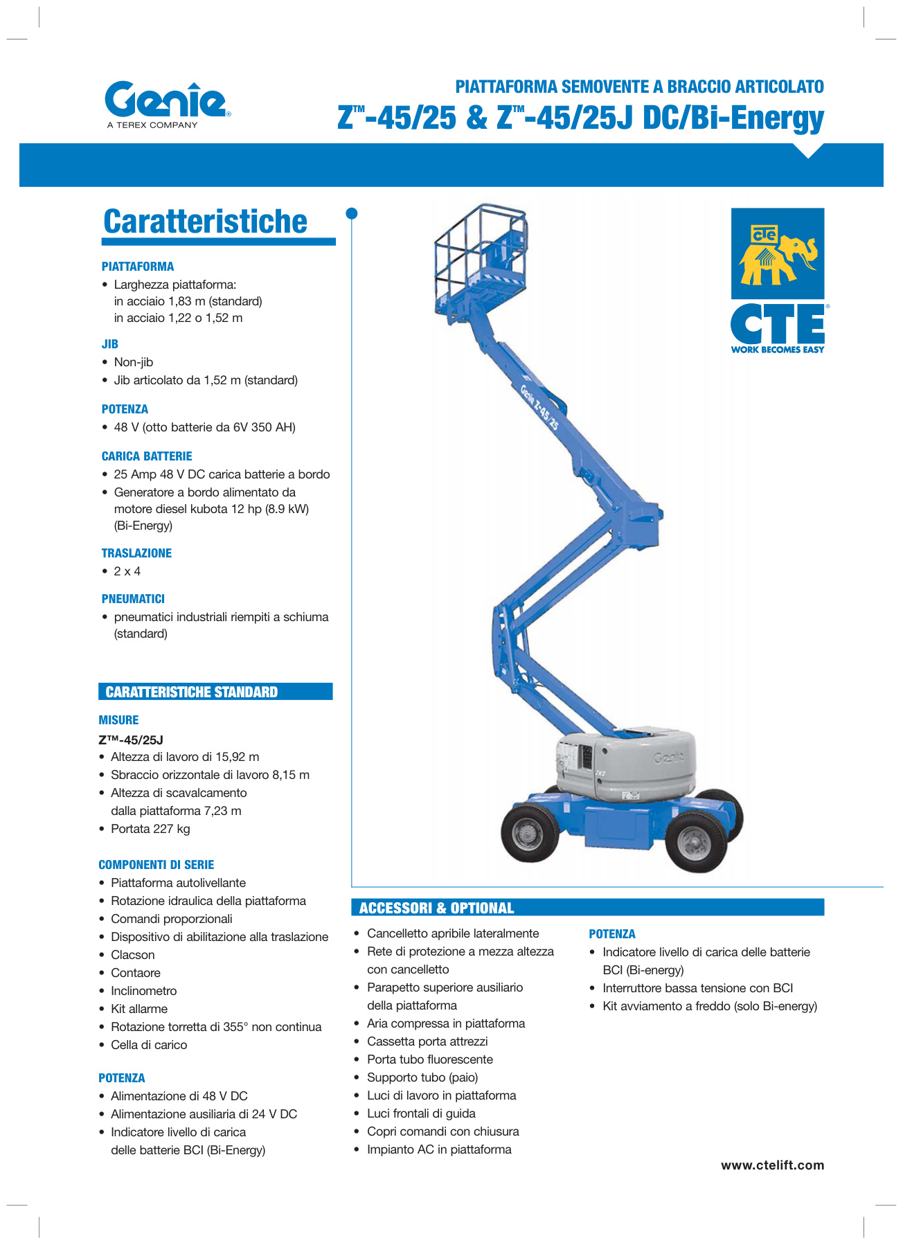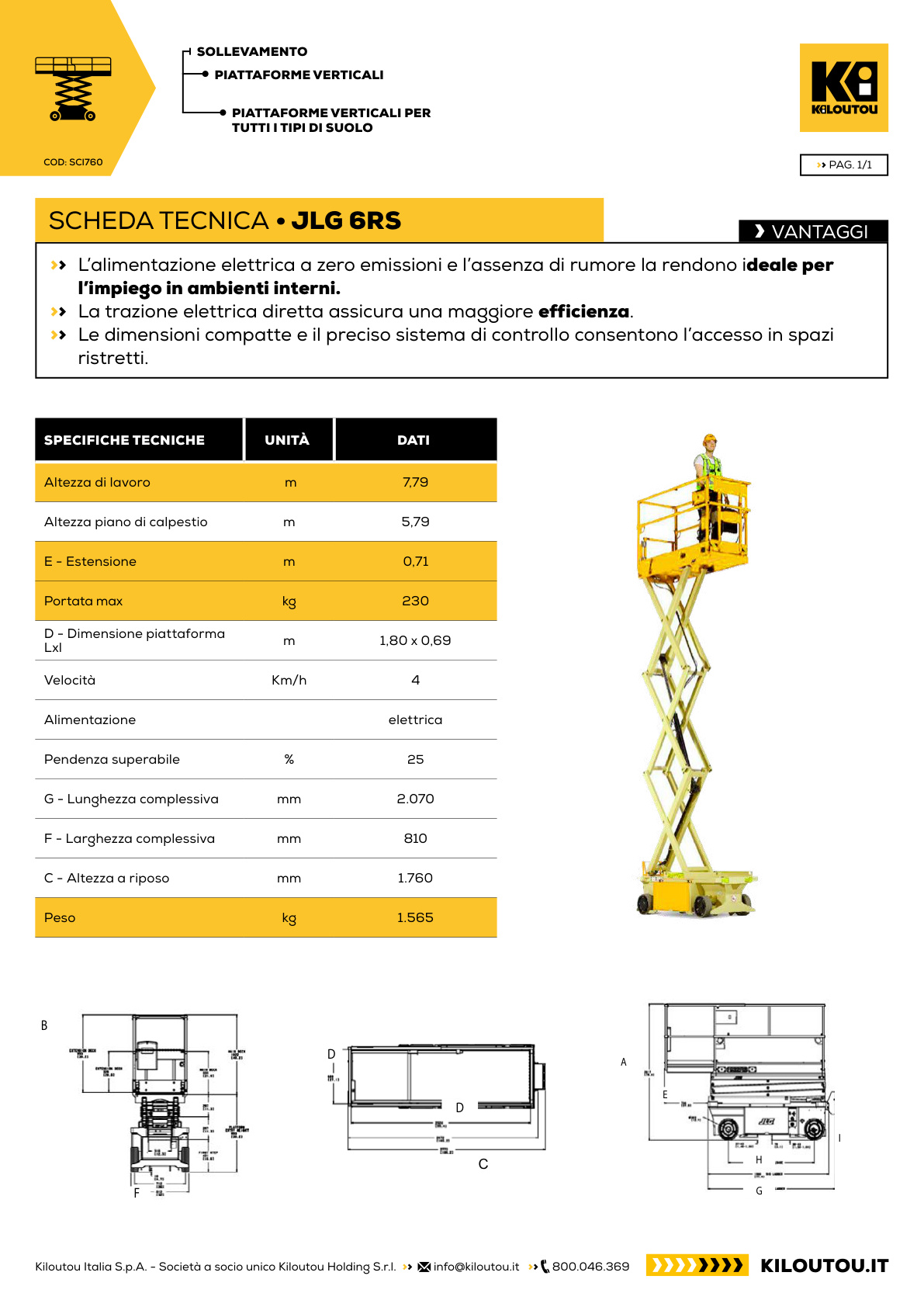 Dotata di trazione elettrica a zero emissioni, garantisce funzionamento silenzioso e autonomia operativa, mentre l’estensione della piattaforma da 0,9 m consente maggiore area di lavoro. Offre elevata stabilità, raggio di sterzata ridotto e capacità di superare pendenze fino al 25%, risultando adatta a manutenzioni, edilizia e lavori industriali.