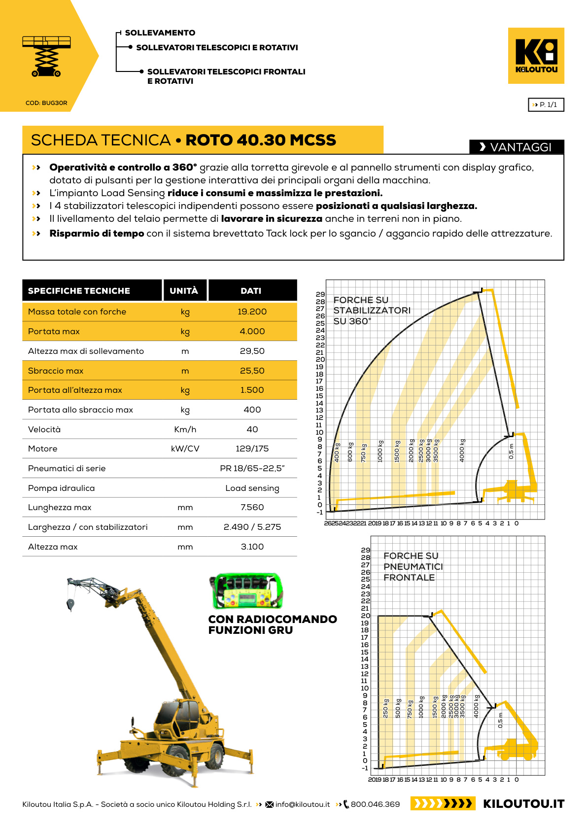 Il Merlo Roto 40.30 è un sollevatore telescopico rotativo ad alte prestazioni progettato per cantieri edili e operazioni di sollevamento complesse. Con una portata massima di 4.000 kg e un’altezza di sollevamento fino a 30 metri, consente di movimentare materiali e attrezzature con grande precisione. La torretta rotante a 360° e gli stabilizzatori permettono di operare in sicurezza anche in spazi ristretti, trasformando la macchina in una soluzione versatile utilizzabile come telescopico, mini-gru o piattaforma di lavoro grazie alle diverse attrezzature applicabili.