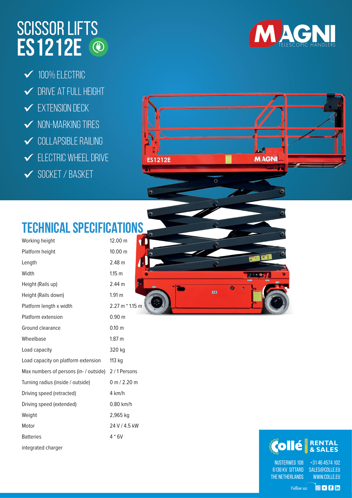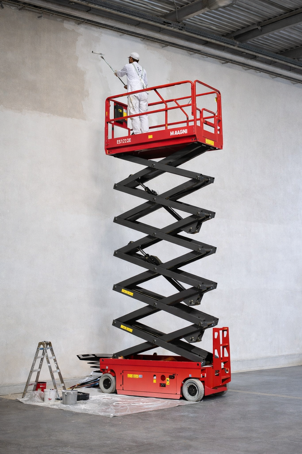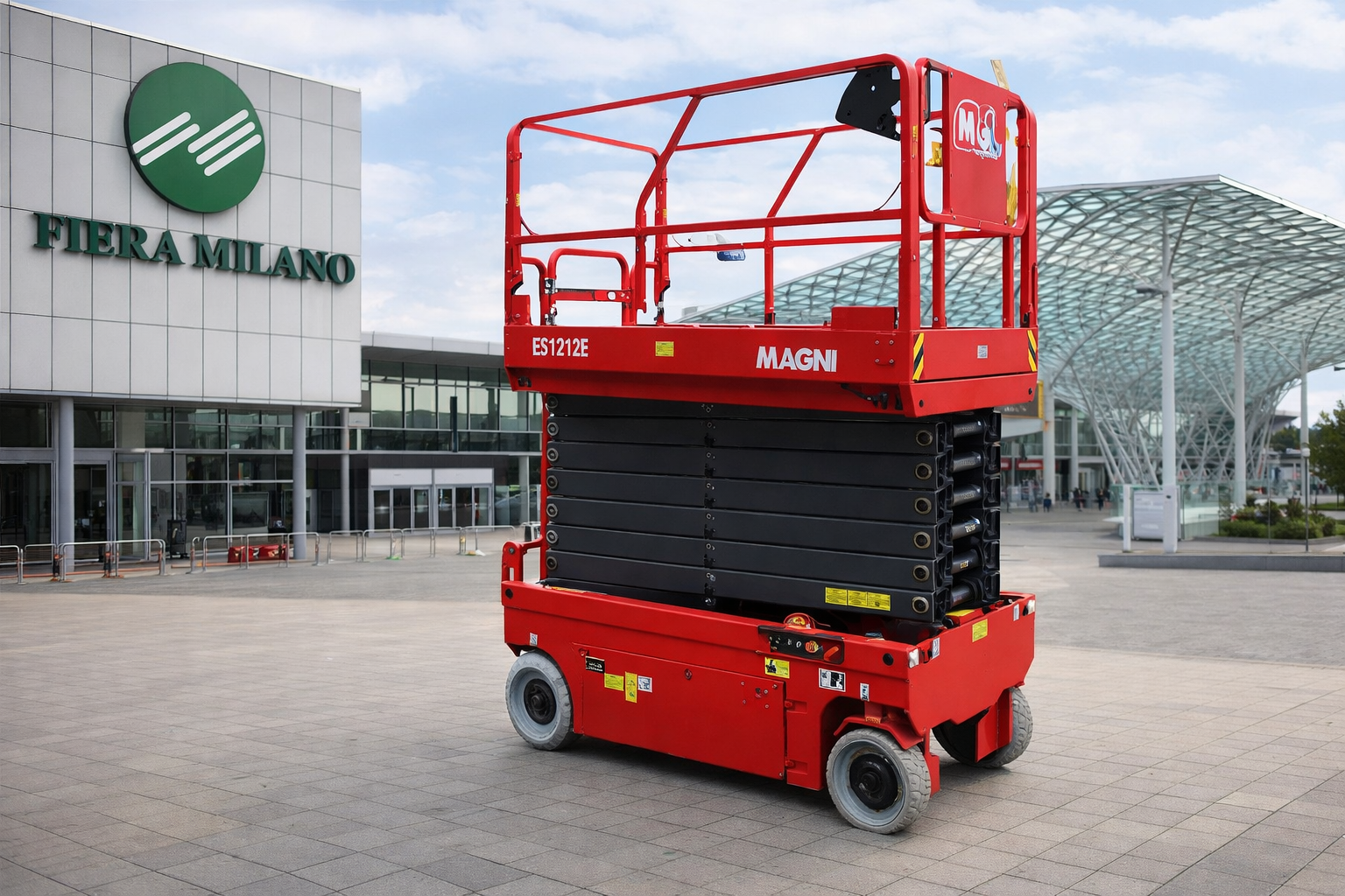 La Magni ES1212E è una piattaforma aerea a pantografo elettrica progettata per lavori in quota fino a 12 m di altezza di lavoro, con una portata massima di 320 kg. Compatta e maneggevole (larghezza 1,15 m), è ideale per utilizzi in ambienti interni ed esterni su superfici livellate.