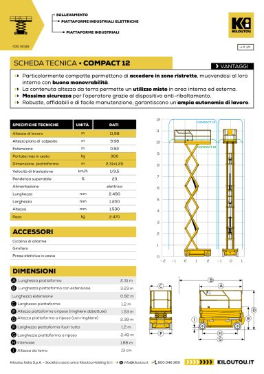 La Haulotte Compact 12 è una piattaforma a pantografo elettrica compatta progettata per lavori in quota in ambienti interni ed esterni su superfici piane. Con un’altezza di lavoro fino a circa 12 metri e una portata del cestello di 300 kg, permette di operare in sicurezza con operatori e attrezzature. Grazie alle dimensioni contenute e all’elevata manovrabilità, è ideale per interventi di manutenzione, installazione impianti, lavori industriali e attività in magazzini o capannoni.